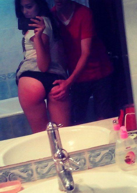 Стройная девушка с анальной пробкой в попке делает селфи перед зеркалом