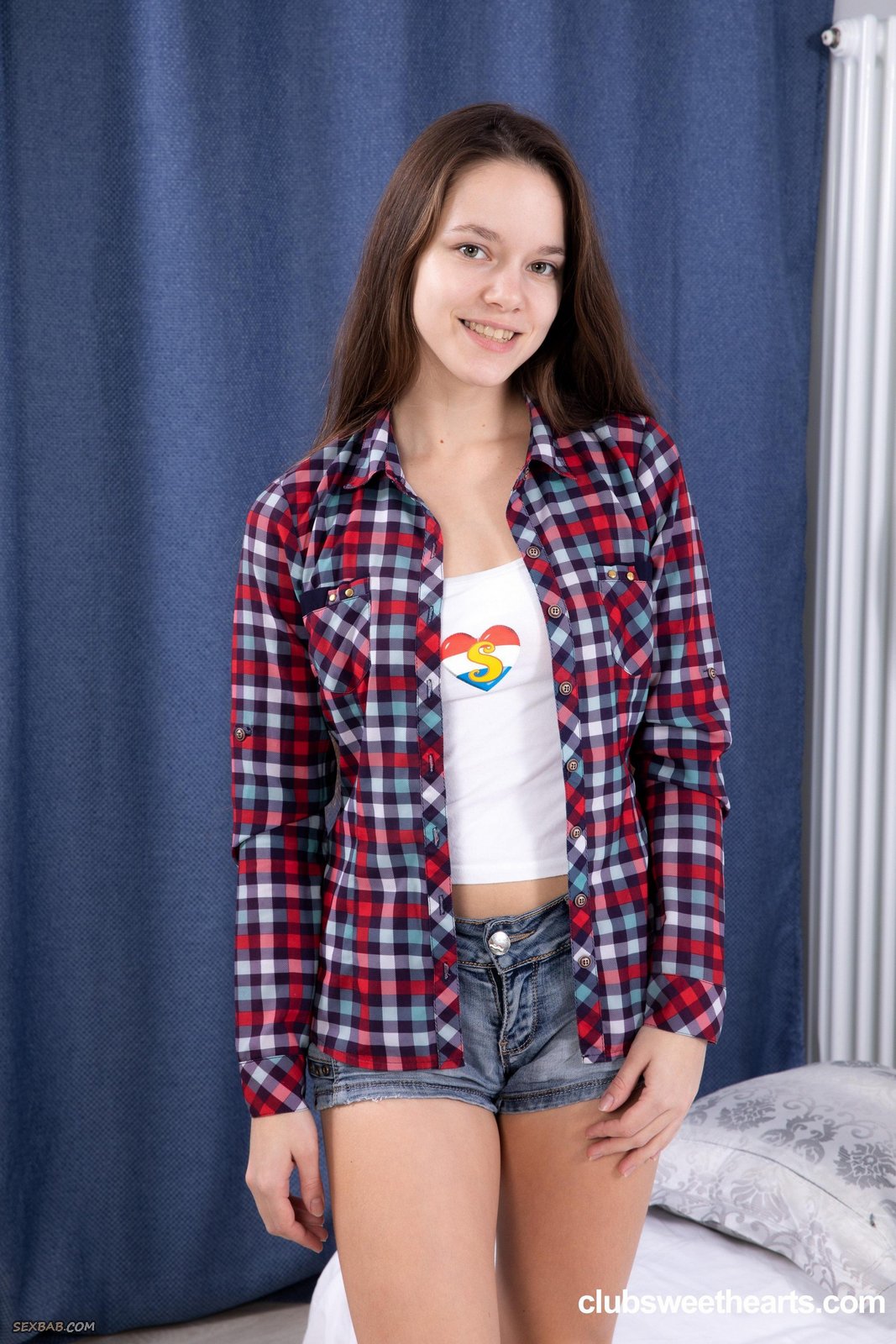 Описание: Игриво сняв перед камерой майку и джинсовые шортики, нежная детка в белых трусиках легла на кровать с широко раздвинутыми ножками и охотно оголила гладкую розовую киску, выпятив крупным планом свою раскрытую промежность и теребя пальчиками маленькие половые губки.