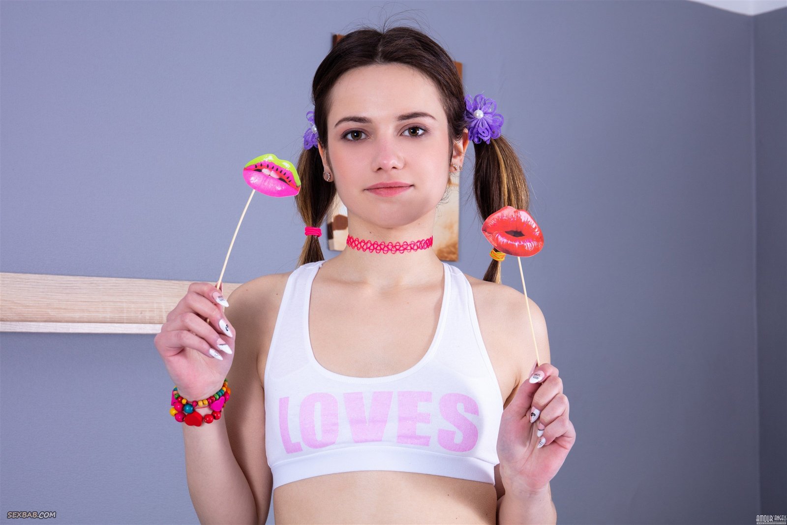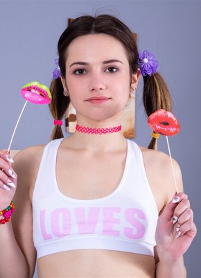 Описание: Игриво позируя перед камерой в короткой маечке и юбке, очаровательная милашка в полосатых гольфах оголила свою бритую нежную киску и энергично принимает на кровати самые развратные позы, приглашающе раздвигая стройные ножки и подзывая первого встречного хорошо провести с ней время.