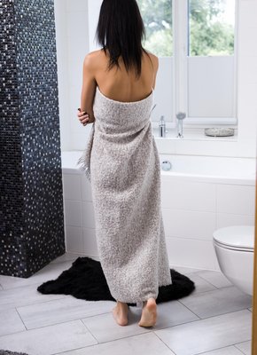 Сисястая брюнетка позирует в ванной комнате