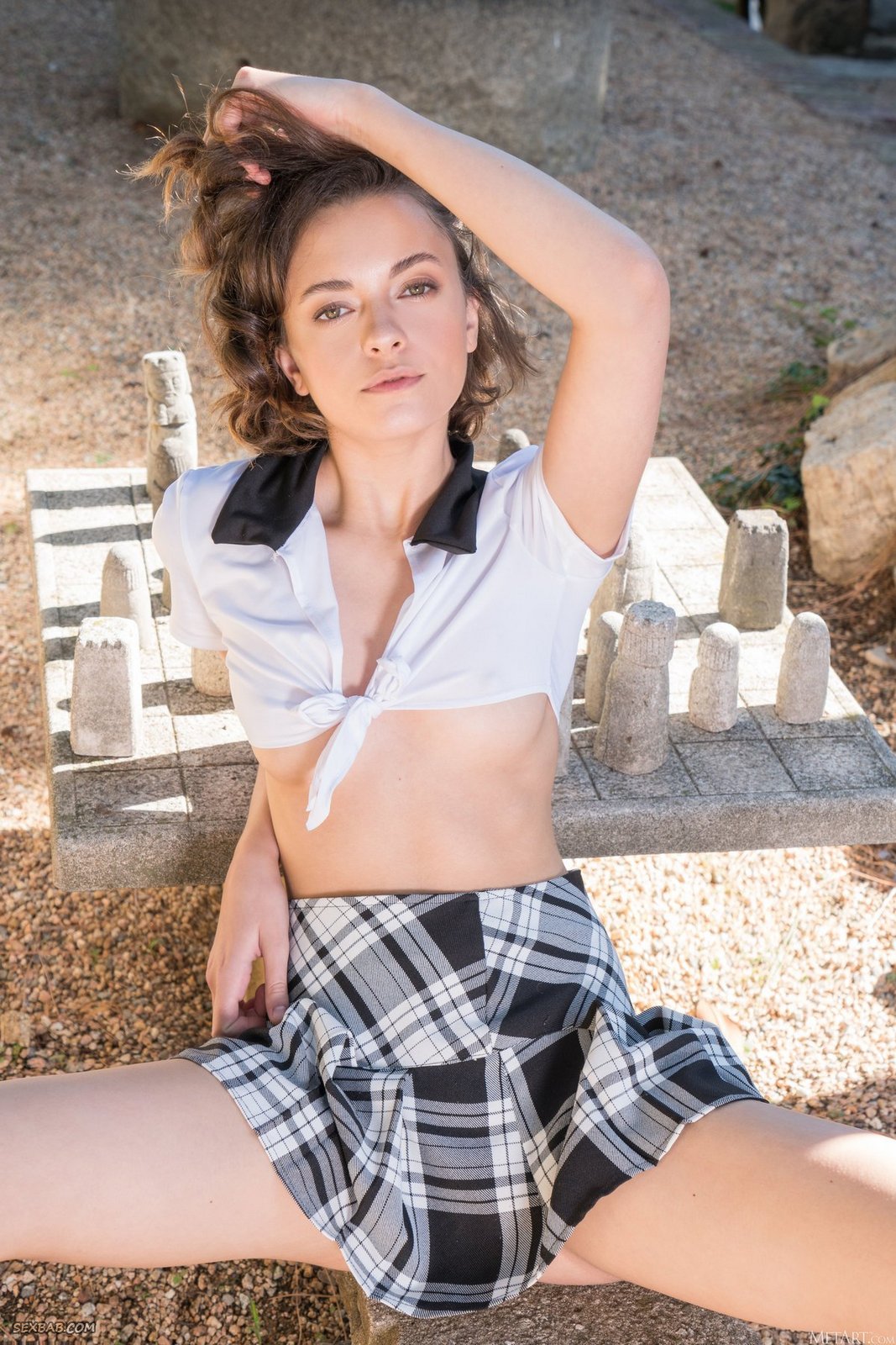 Описание: Бесстыже флиртуя со своим фотографом, молодая шалунья в короткой клетчатой юбке развратно раздвинула свои красивые ножки и возбуждающе раскрыла перед камерой свою голую бритую промежность. Затем дерзкая девица полностью разделась до гола и, светя своими маленькими титьками, с разных ракурсов засветила свою аппетитную попочку с нежной розовой киской.
