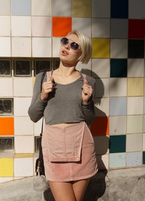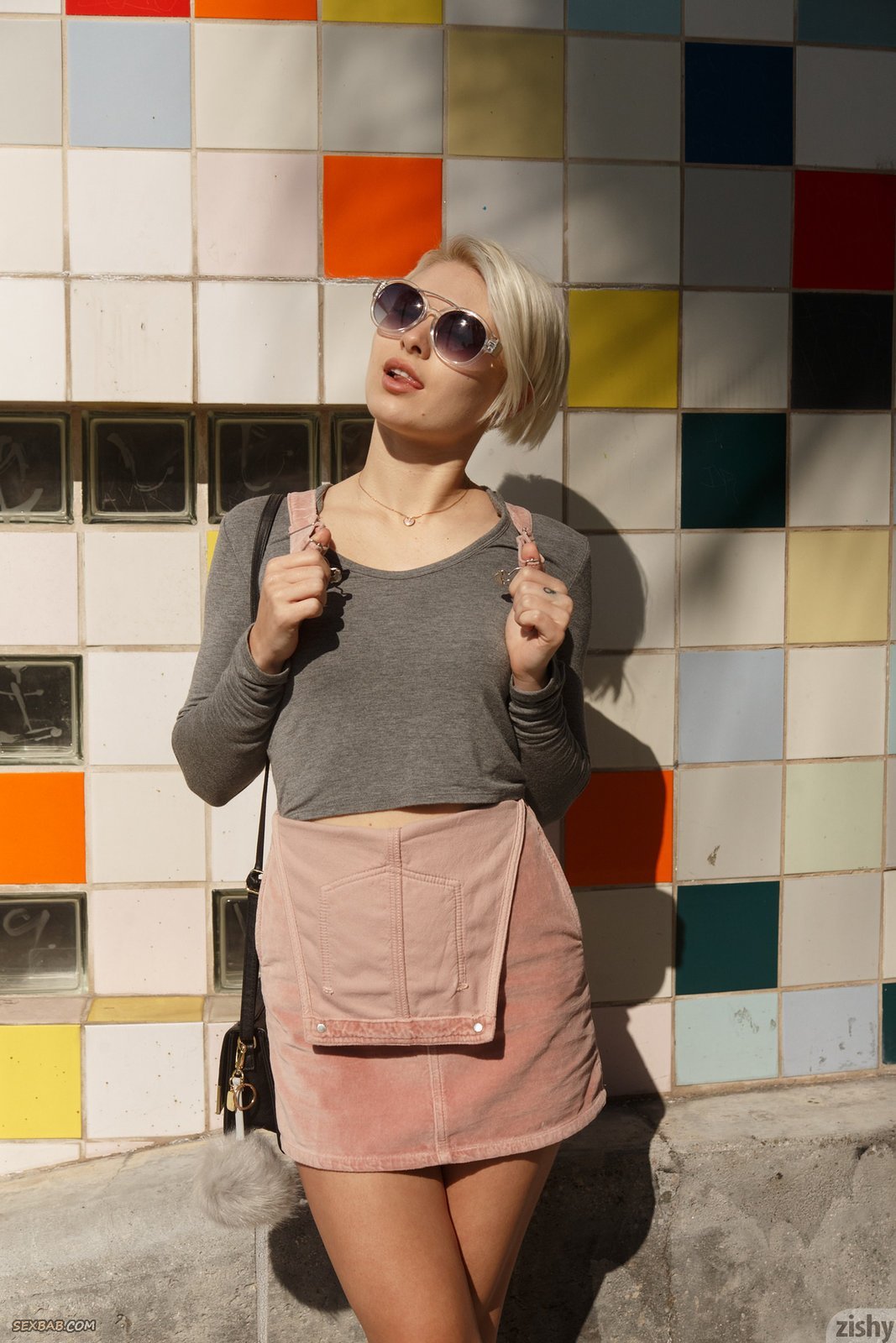 Описание: Молоденькая блондинка с короткой стрижкой прогуливается по городу и мило улыбаясь засвечивает маленькие торчащие сиськи с набрякшими сосочками. В процессе съёмки, стройная девушка пыталась казаться как можно более соблазнительной и порой задирала юбку, позволяя нам увидеть её трусики с упругими подтянутыми ляжками.