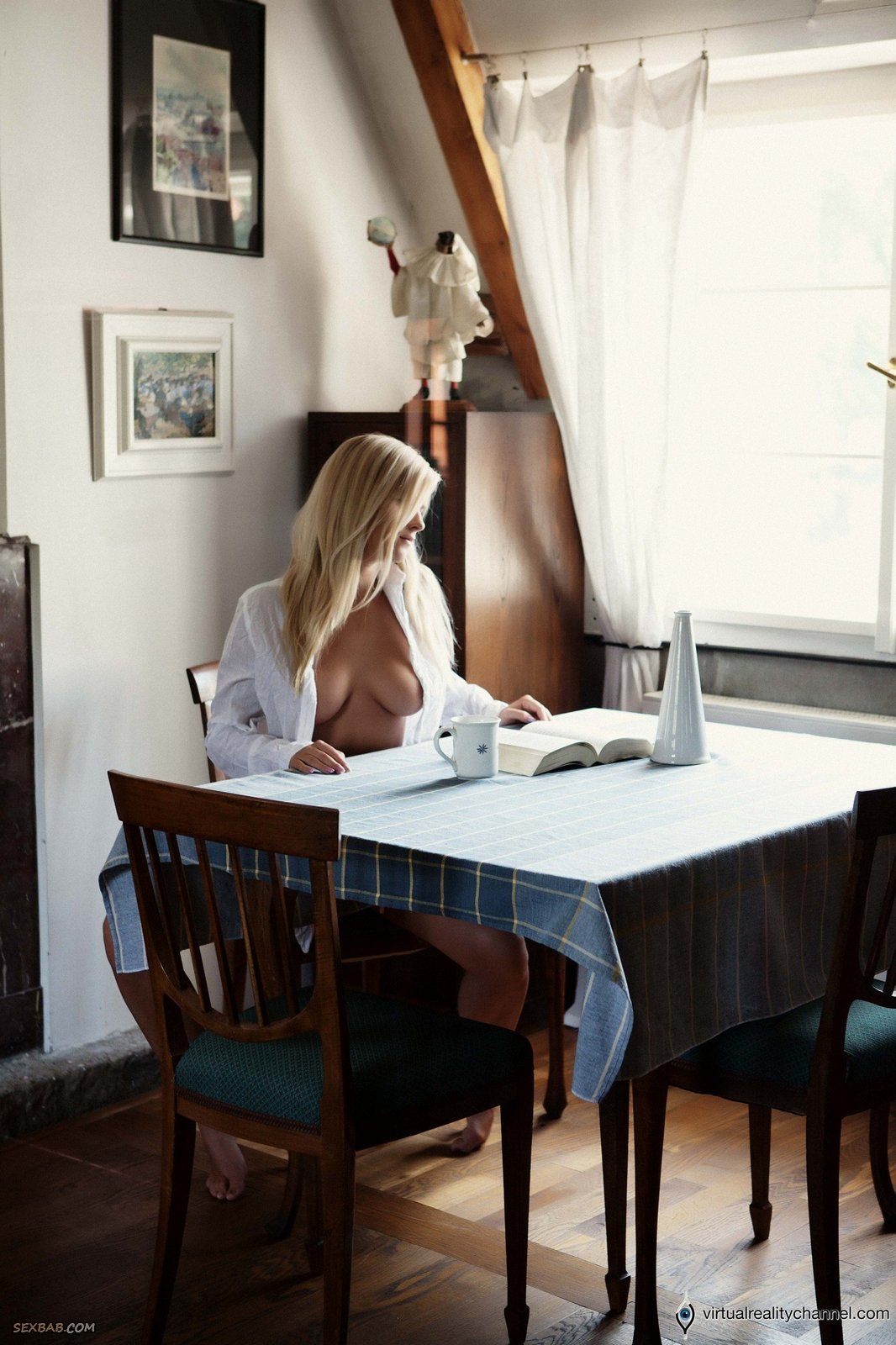 Описание: Развратная блондинка с возбуждающими аппетитными формами чувственно ласкает руками свое мягкое нежное тело и постепенно снимает с себя белые трусы. Оказавшись перед камерой абсолютно обнаженной, бесстыжая девка резво залезает на стол и начинает страстно позировать всем телом, выставляя на показ свою голую бритую промежность с аккуратной интимной стрижкой на лобке.