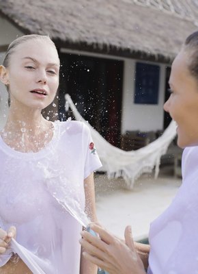 Описание: Весело играясь у бассейна и поливая друг друга водой, две сексуальные милашки в мокрых футболках эротично засвечивают свои упругие натуральные сиськи через просвечивающую ткань. Затем молодые стройняшки медленно сняли с себя всю одежду, развратно выставляя на показ свои аппетитные подтянутые попки и бритые сладкие писечки.