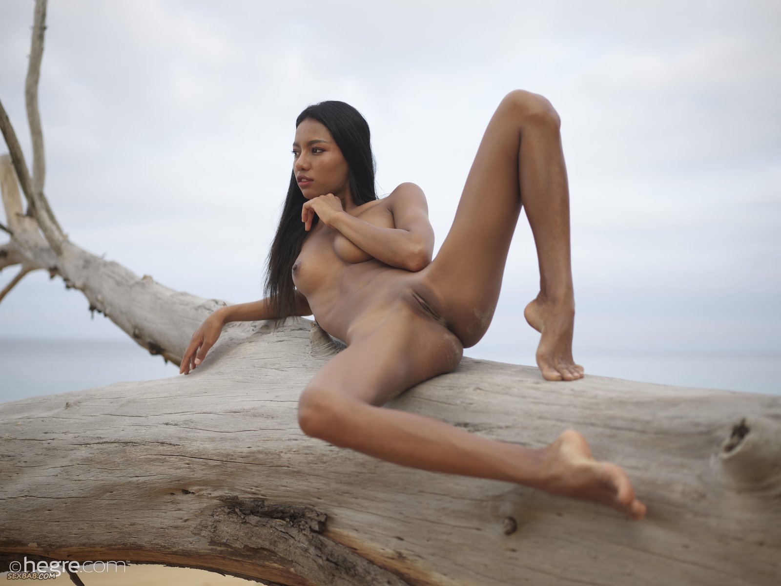Описание: Медленно сняв с себя трусики, голая темнокожая азиатка откровенно позирует на пустынном пляже и демонстрирует все свои возбуждающие интимные места. Бесстыжая брюнетка чувственно выпячивает свои натуральные сиськи с острыми темными сосками, а затем широко раздвигает ноги и показывает бритую темную промежность.