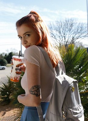 Рыжая шалунья гуляет в короткой юбке