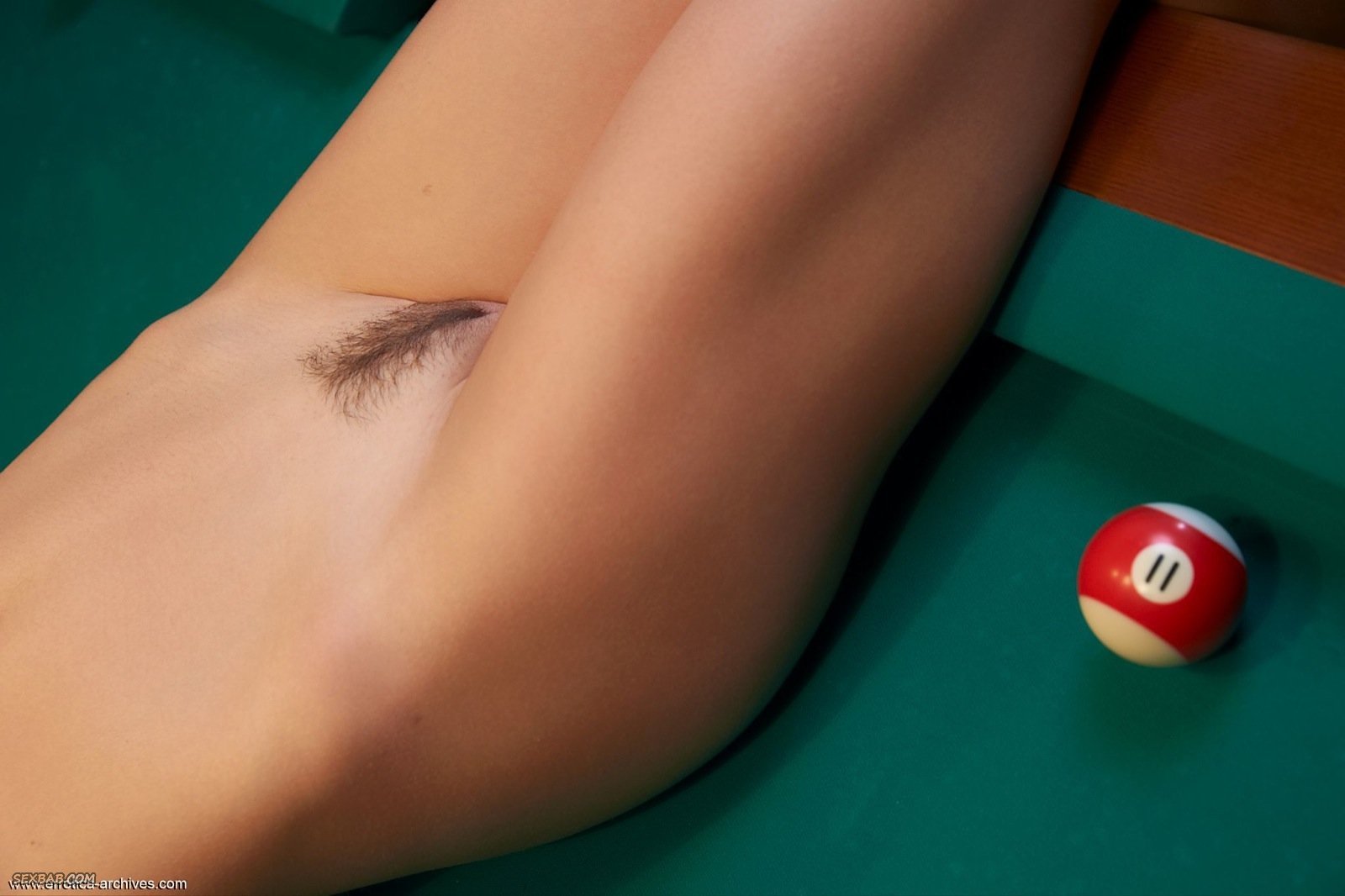 Голая девушка лежит на бильярдном столе