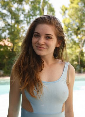 Рыжая девка в купальнике позирует рядом с бассейном