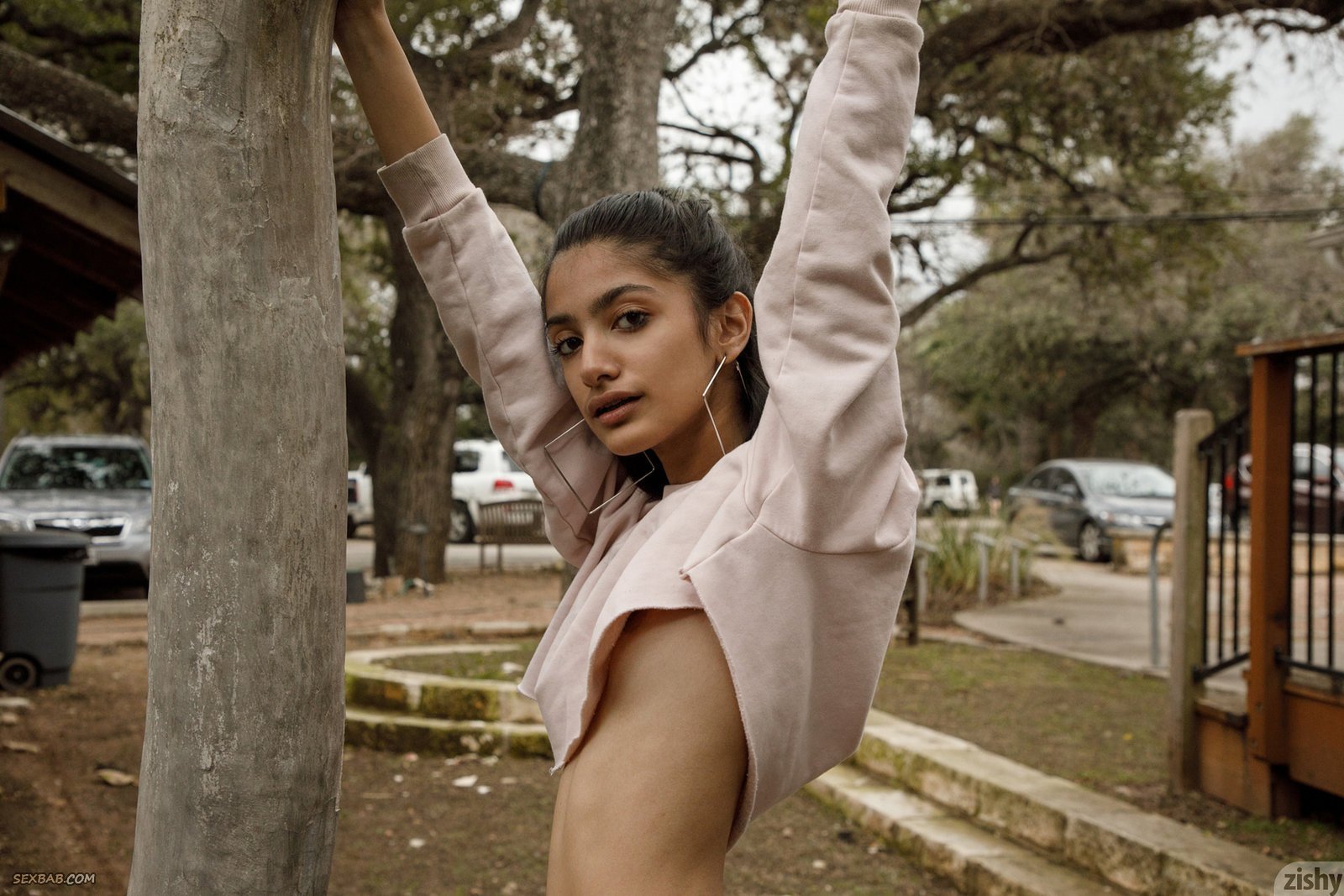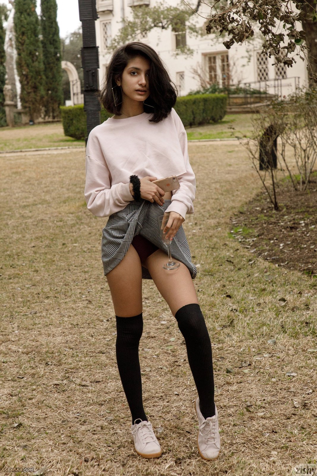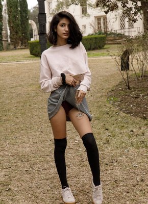 Описание: Привлекательная молодая индуска с худенькой фигурой в короткой юбке и черных гольфах соблазнительно вертится перед камерой, гуляя на улице. В процессе съёмки, стройняшка показывала плоские сиськи, а прогибаясь раком засветила трусы под юбкой, нежно поглаживая себя руками при этом.