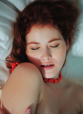 Рыжая голая девушка выставила попочку на кровати