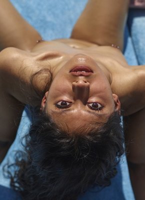 Описание: Экзотической внешности тощая брюнетка голой загарает на заднем дворе своего дома. Девушка намазалась каким-то маслом, от чего её худенькое тело буквально светится в лучах солнца. А принимая откровенные позы она позволяет нам насладиться всеми её прелестями, включая маленькие сиськи и бритую письку.