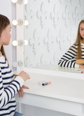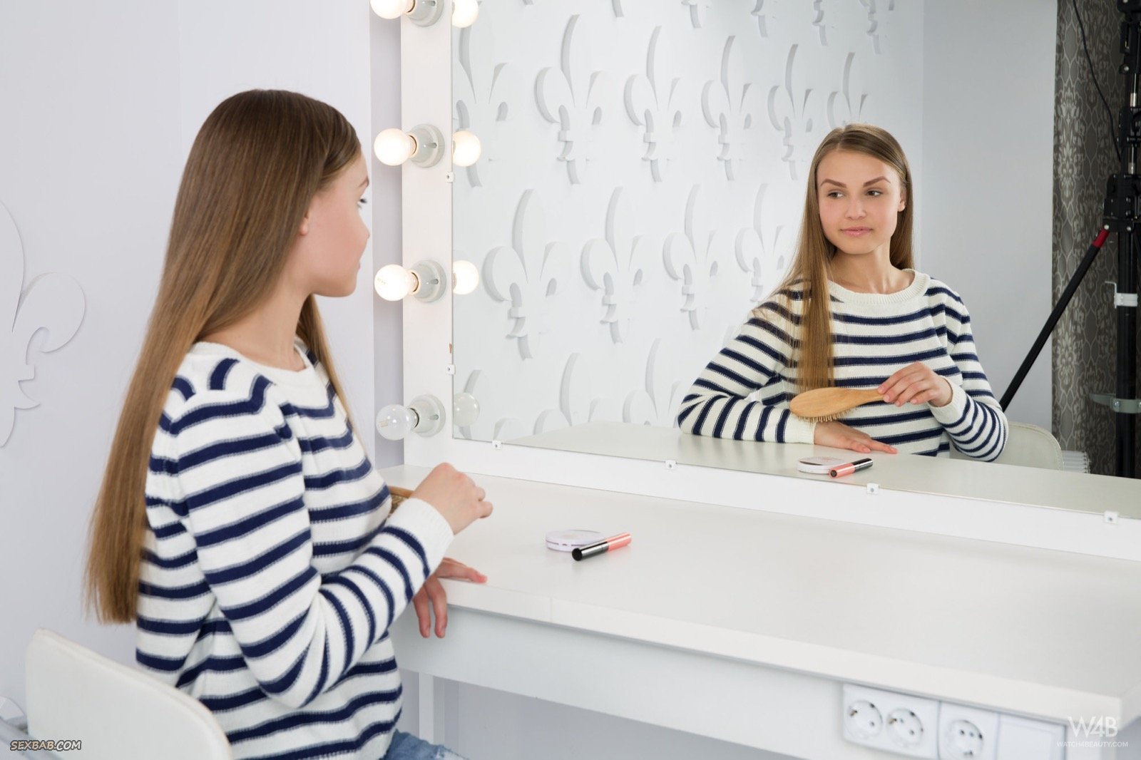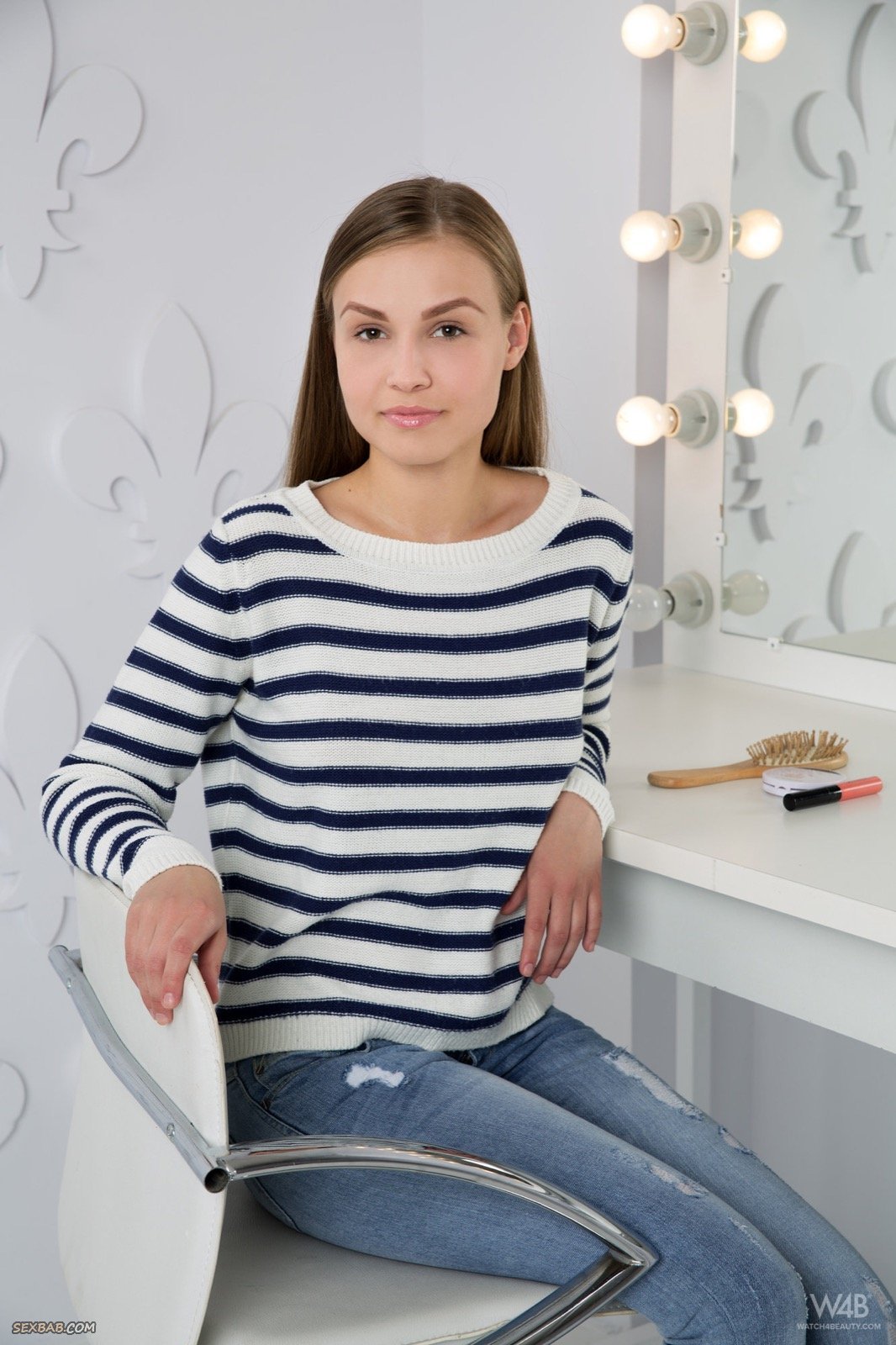 Описание: Устроившись рядом с зеркалом, в гримерке, привлекательная модель со стройной фигурой, одетая в джинсы и кофточку, начинает медленно раздеваться догола, в процессе как можно возбуждающе стягивая трусики. В обнаженном виде обворожительная крошка показывает маленькие сиськи, параллельно сжимая их руками, а так же демонстрирует гладко выбитую киску.
