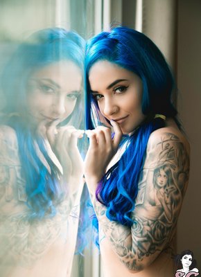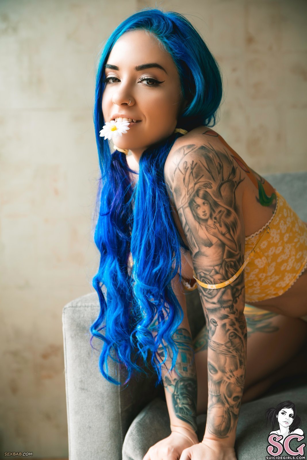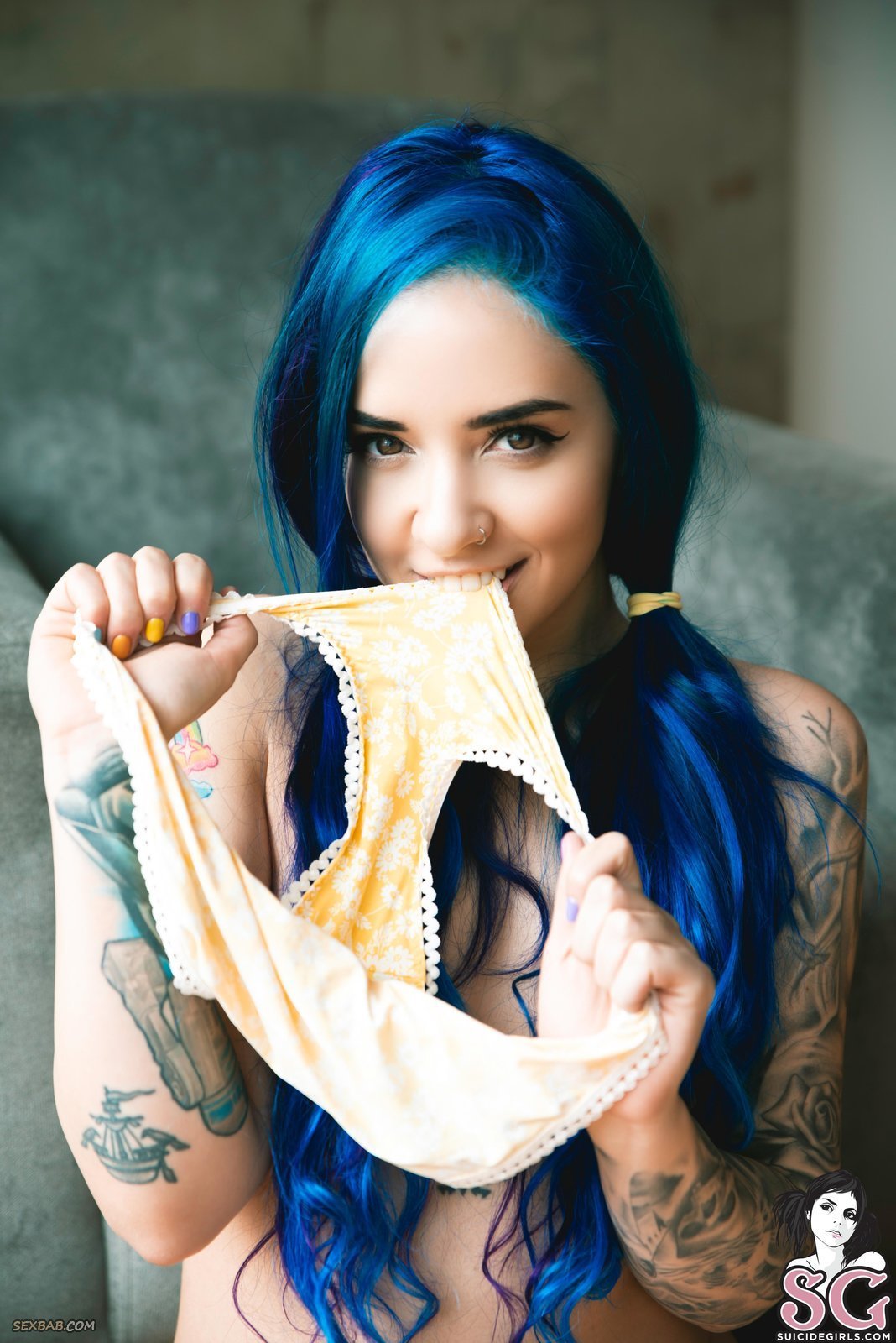 Описание: Босая милая неформалка с синими волосами в неглиже, надев юбку с трусиками и топик, эротично позирует дома и улыбаясь строит глазки в камеру. Соблазняя нас своим скромным взглядом, сексуальная модель вскоре раздевается догола и предстаёт перед нами во всей своей красе, смущённо прикрывая маленькие сиськи и скрещивая ноги.